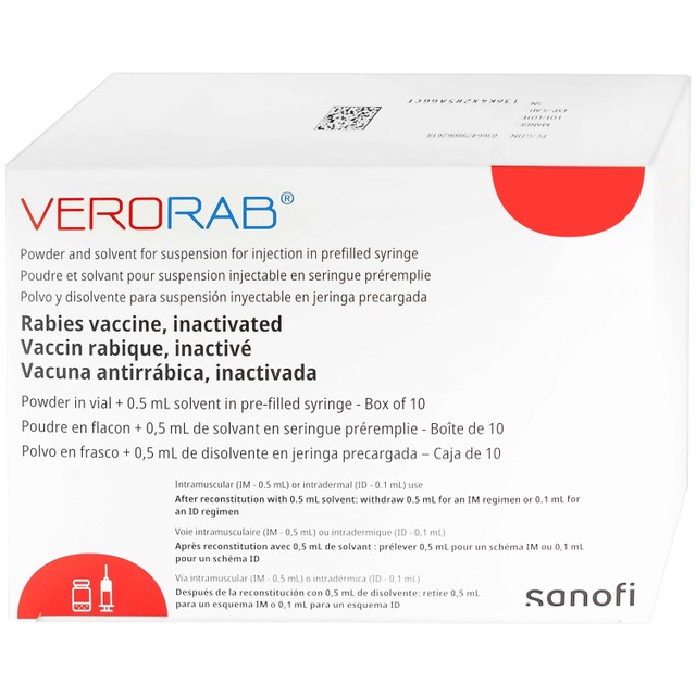 Vắc xin VERORAB (Pháp) là vắc xin phòng dại tế bào vero tinh chế, có tác dụng tạo miễn dịch chủ động phòng bệnh dại cho cả người lớn và trẻ em, sau khi tiếp xúc hoặc bị con vật nghi bị dại cắn. Có thể sử dụng vắc xin để phòng ngừa chủ động trước phơi nhiễm.